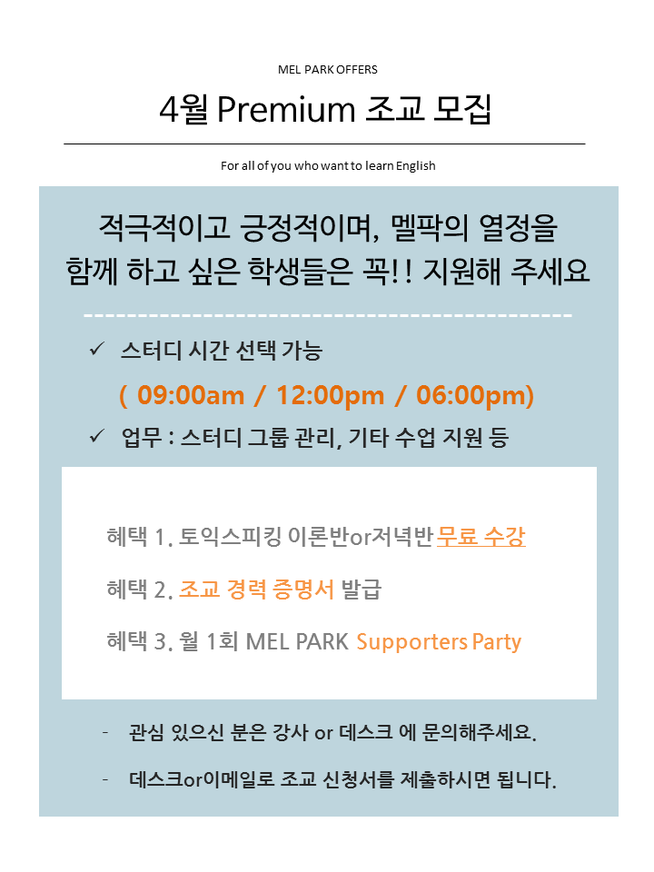 공지 | 멜팍어학원 2016년 4월 프리미엄조교 모집~!!