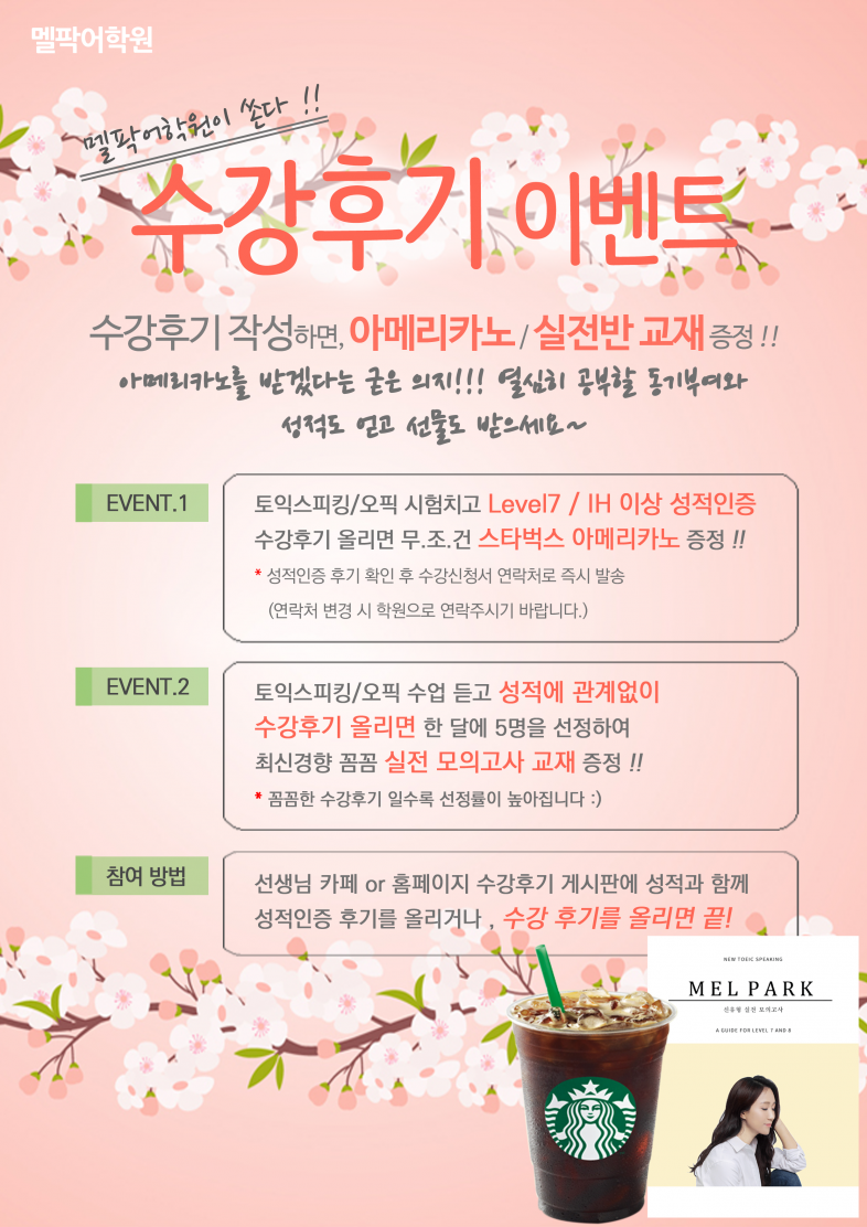 이벤트 | 멜팍어학원 수강후기 이벤트~! 페이지 정보 작성자 MELPARK 작성일16-03-15 11:07 조회3,960회 댓글0건 이전글 다음글 검색 목록 본문 멜팍어학원 성적인증/수강후기 이벤트~!!성적향상을 위한 동기부여와 함께아메리카노 받고 실전반 교재로 고득점 노려보세요~!! 댓글목록 등록된 댓글이 없습니다. 이전글 다음글 검색 목록