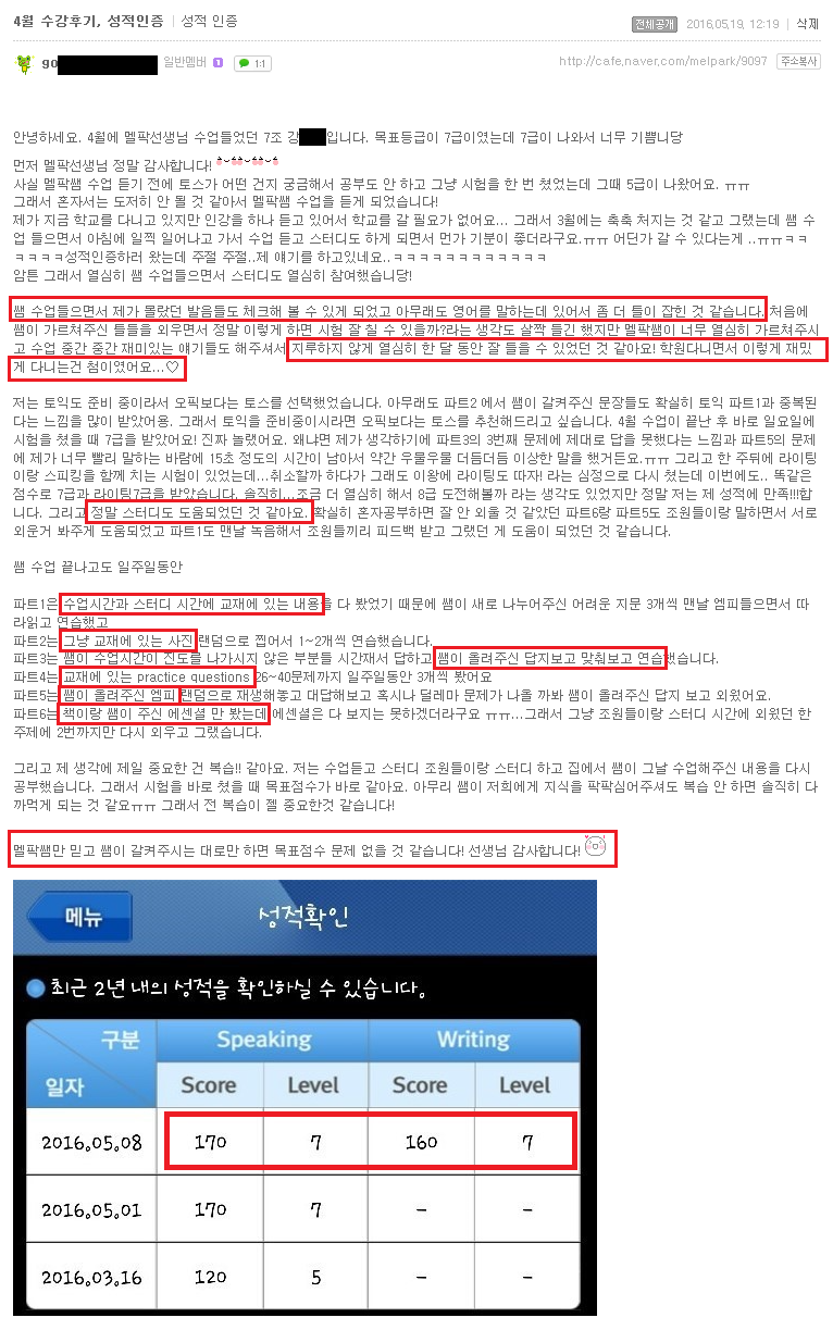토스 | (대구토스 7급후기) 목표등급 7급을 받아서 너무 기뻐요~~ 페이지 정보 작성자 MELPARK 작성일16-05-25 10:09 조회4,276회 댓글0건 이전글 다음글 목록 본문 (클릭 하시면 크게 보실 수 있습니다.) 수강생 후기 입니다. 더 많은 후기는 우측 카페 링크 가입 후 보실 수 있습니다. 이전글 다음글 목록